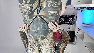 Salacious emo tart dressed in black leather clothing prefers to get taken for a turn at the bunghole by two-fisted dude