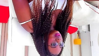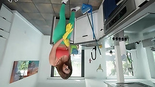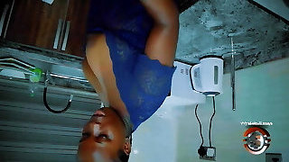 Big dark-hued titties maid went from sweeping her bathroom floor to fucking her tight twat with dildo