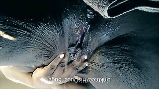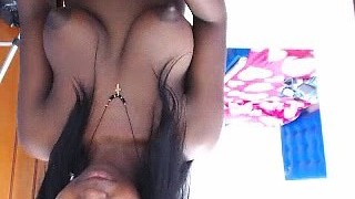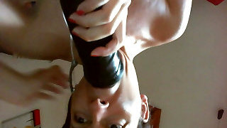 Big dark-hued titties maid went from sweeping her bathroom floor to fucking her tight twat with dildo
