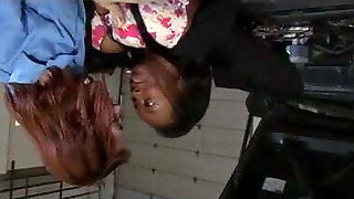 Buxomy black chick and sexy ginger are blackmailed by pervert dude to fuck each other and then fuck him